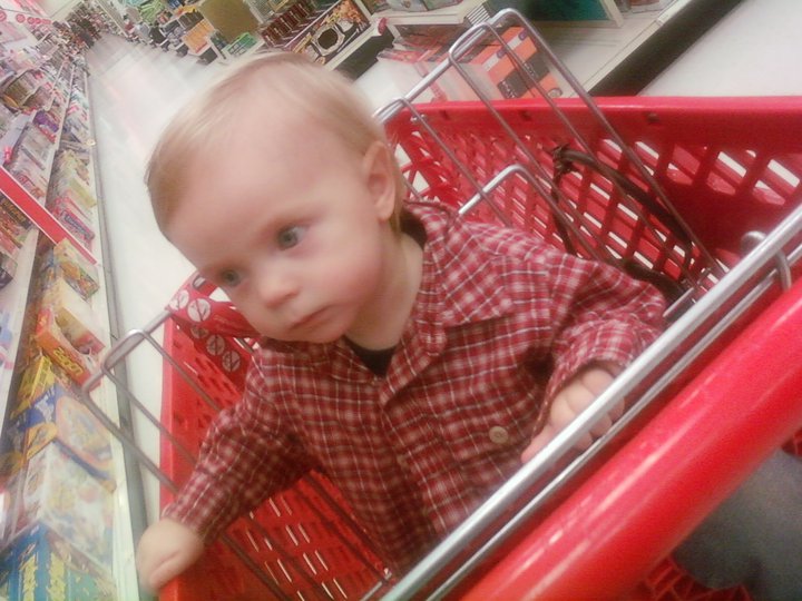 1) I took Samuel to Target on his birthday. He got to ride in the cart for the first time. From the looks of the picture below, I’m not sure what he thought of it.