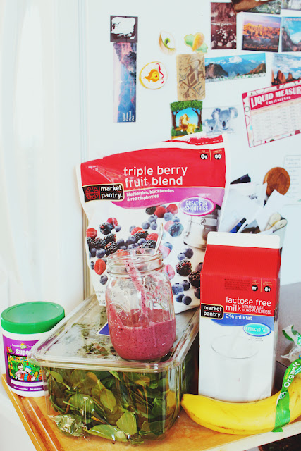 Frozen berries, a couple handfuls of organic spinach (love Costco’s huge box for $3.99), lactose free milk (they’ve taken Samuel off of lactose for 3months), a couple organic bananas, and powdered Kids Super Food. Later today I’m going to pick up some protein powder (whey free) to add some more calories. And I’m going to start adding a spoonful of organic coconut oil.