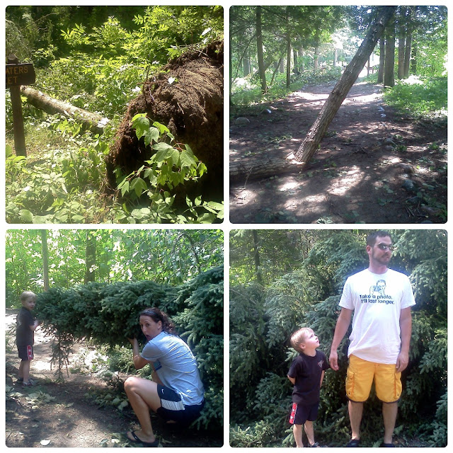The pics below are a couple of pictures from around the resort after that storm. One was the tree that snapped next to the shore and the middle on is of a dock that flipped over when the straight line winds came rolling in. And for those of you wondering about my fishing ability – last night Samuel and I {with the help of my Aunt Debbie} pulled in a Northern and a Rock Bass. Samuel was not too excited about those slimy fish. I however, was quite proud.