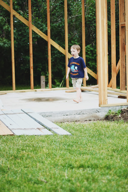 I sat on the concrete step with Samuel and chatted with my brother and sister as they worked high in the rafters of the new shed — nailing board after board and joist after joist in place. Samuel played with rocks. And was content like his momma.