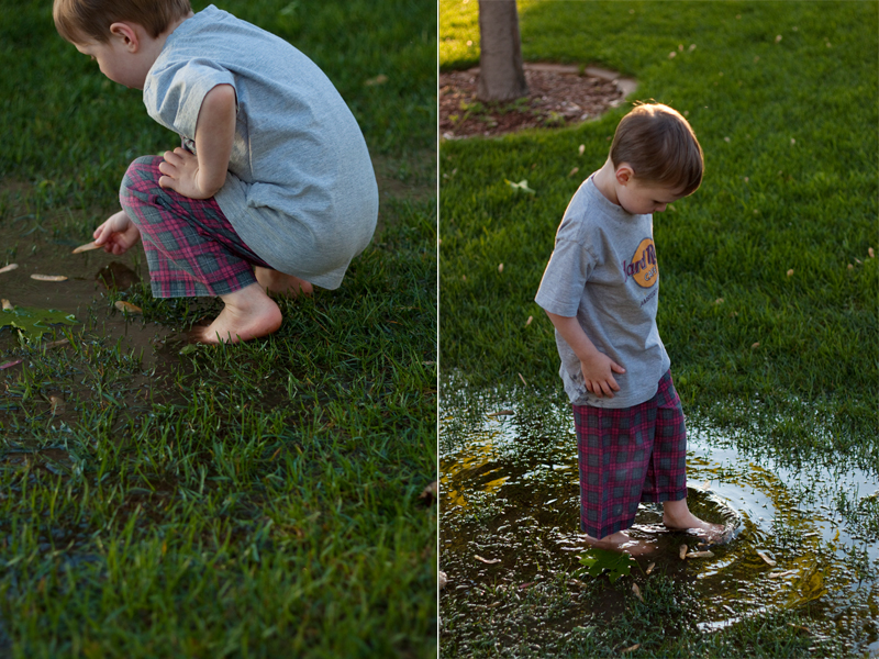 It started when he slipped out the backdoor, wearing his red plaid pajama pants, on a hazy sunset golden hour night. His little four year old feet racing across the much needing of new stain deck, down the stairs, by the garden with the peas finally sprouting up, and over to the ditch inbetween the yards. There, in it’s glorious state of left-over rainness {that’s my new word} was a wonderful, tempting, just sitting there, large puddle.